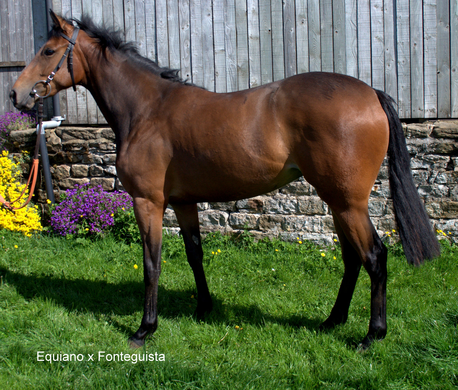 Back in November last year a lovely EQUIANO filly, bred by the sire's owner James Acheson, arrived at Ann Duffields Constable Burton Yard. With arriving so late in the year, having just come out of a field in Ireland, she was a lot more backward than the rest of Ann's yearling bunch. The majority of her other peers, had been through the sales ring, so were a lot more advanced in their education. One of the reasons she arrived at Ann's in the first place, was that her breeder said Ann had such a good record with the sire's progeny, so wanted to send her to Sunhill. It quickly became obvious that she would need time & patience, so Ann took the decision to turn her out for the summer in a field. That decision has now been rewarded, as she has really blossomed as a result. She is now in full work at the yard & Ann expects her to be ready to make her racecourse debut, at the end of September.